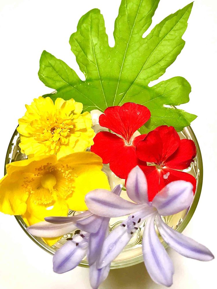 コップの舟に浮かべたオリンピック色のお花たちに💁