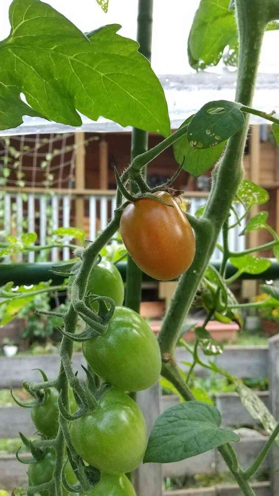 朝靄がかかる今朝、ミニトマトが赤くなりかけていました🍅😊