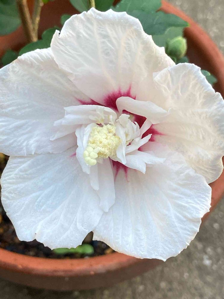 今朝の花 嬉しい!挿し木2番目のムクゲ(木槿)の花が咲きました。半八重咲き白花でした。