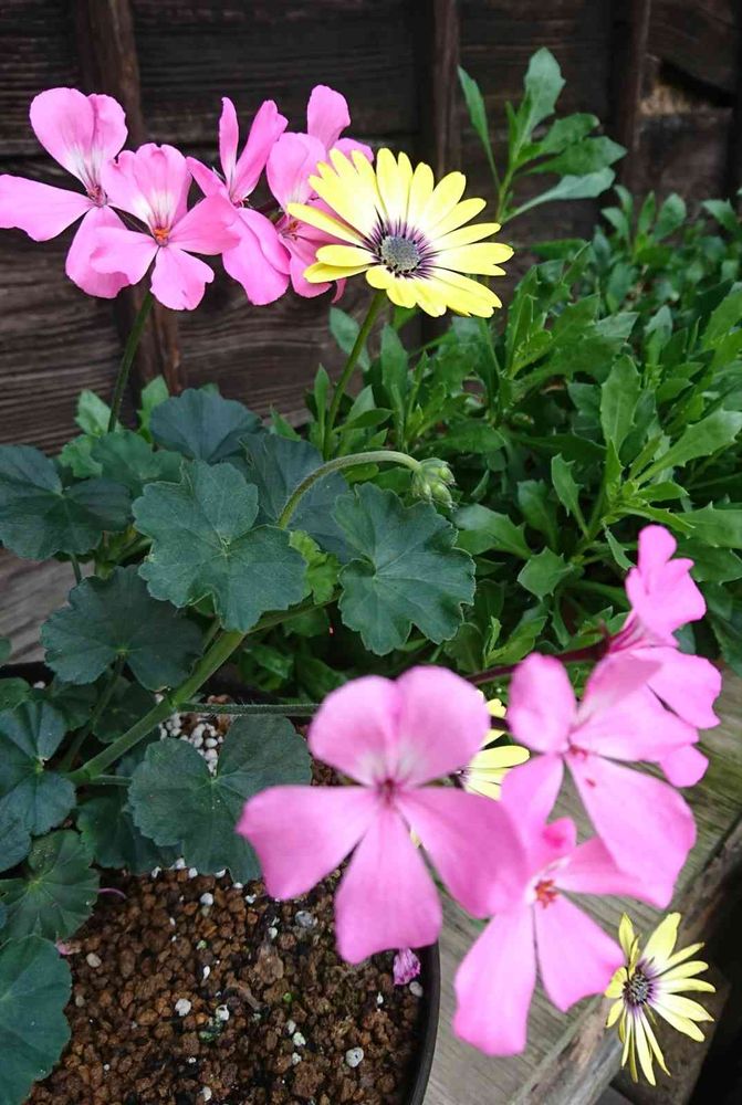 玄関周りに お迎えしてる オステオスペルマム & ゼラニウムさんです😋…