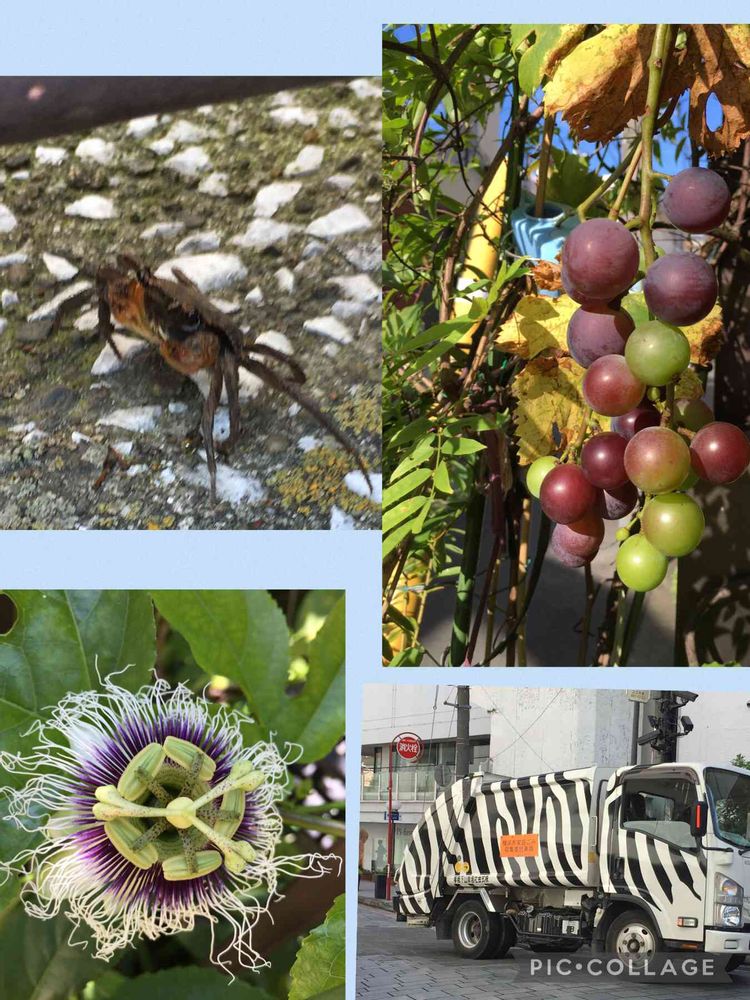 家の、今日のお花の時計草。昨日出しましたが、せっかくなので、もう一度。巨峰も少しずつ色付いて来ました。昨日のゴミ収集車は可愛いゼブラ🦓柄。そして、商店街を歩いていたら、保育園の子供達が何かを見ています。何かと思ったら、カニ🦀さんでした。海が近いとはいえ、ここで見た事ありません。捕まえて橋のたもとに放してあげました。カニ捕まえたの何十年ぶりだろ。可愛い💕かった。海が見えるから帰れるね^o^。