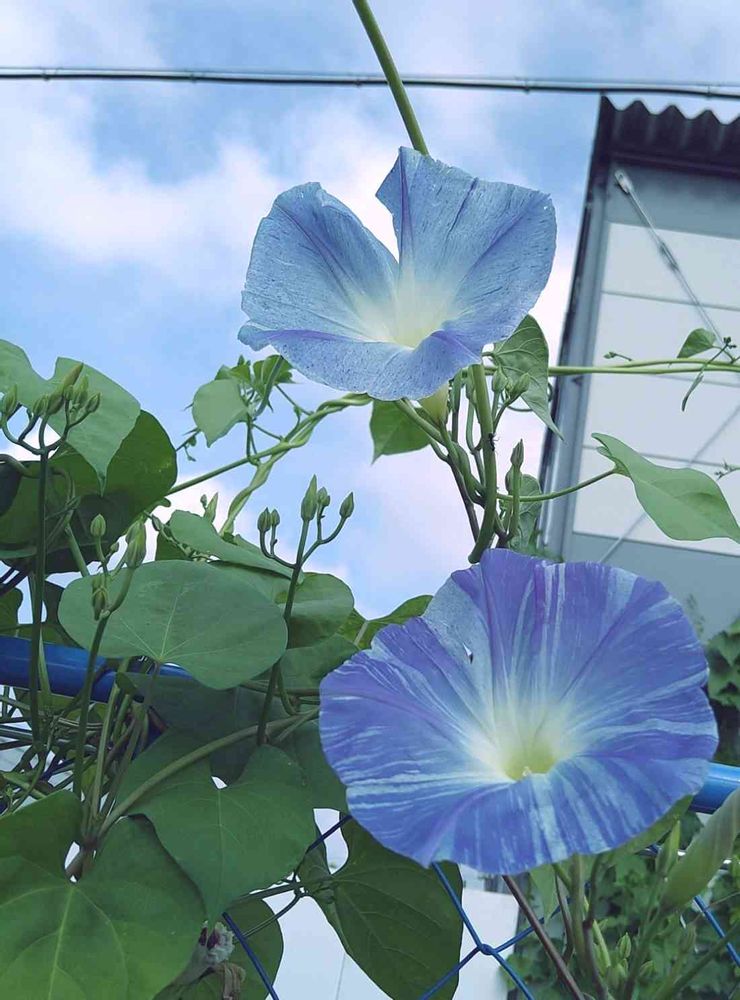 我が家の朝顔も高➰➰➰い所で咲いています😉