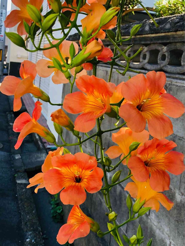 散歩中、オレンジ色のお花が、塀を乗り越えて👀🧡😃