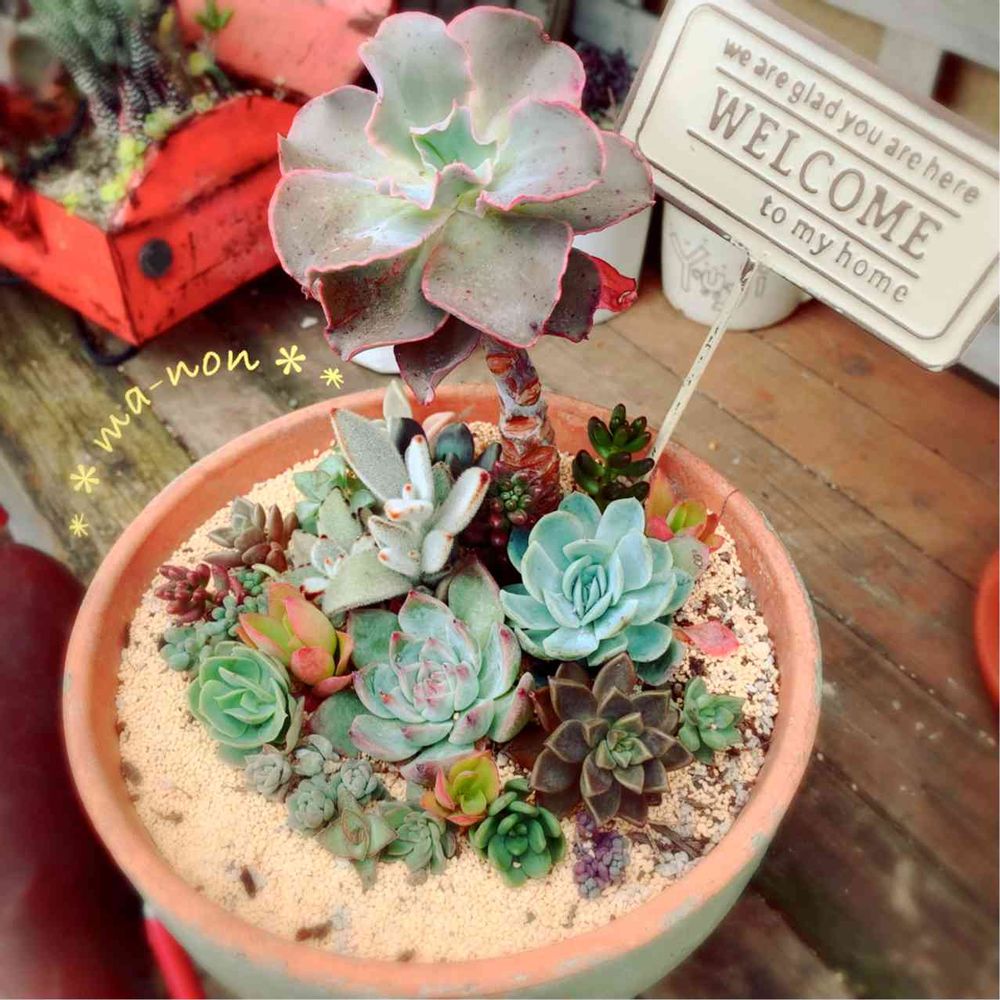 こんにちは☺️まあのんです 2016.5.16日にGSスタート♪ 多肉植物をメインに時々草花も育てています。(ここ数年はほぼタニクばかり😅)タニクさんにじわじわ魅了されて早11年ほど。(2024年時点)小さな葉っぱも捨てられず、どんどんタニクさんが増えてしまいます💦でも小さな葉から頑張って小さな根や芽が出ているのを見ると、愛おしくてたまらないのです🥰 ここ2〜3年はDAISO産のサボテンをいくつか買ってそのフォルムと花の鮮やかさに感動しています🥹 DIYや手芸などのハンドメイドも全般的に大好きで、備忘録用にちょこっと載せたりするかもしれません。 ここ数年、好みと真逆な男前な雑貨やジャンク風にハマっていましたが、2023年ごろから北欧インテリアやアイテムに好みが移行しました😅(元々好きでした)ナチュラルなカラーやアンティークなホワイト系ゴールド系をメインにあまり汚しすぎてない物が好き🥰少しだけこならせる。 時々、みなさんの素敵な植物やアイデアも参考にさせていただいたりもしています♫