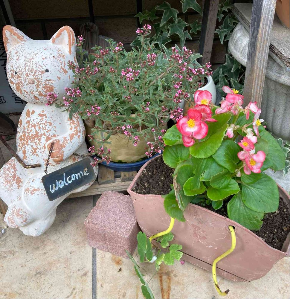 クーペリーもベゴニアも見せたいし、今日は勿論ニャンニャン祭りに参加ですが、1番見せたかったのは、わざと裏返した吊り鉢‼️フェンスの向こうで気が付かなかったけど、底からど根性オダマキが生えてました💕拡大して見てね‼️