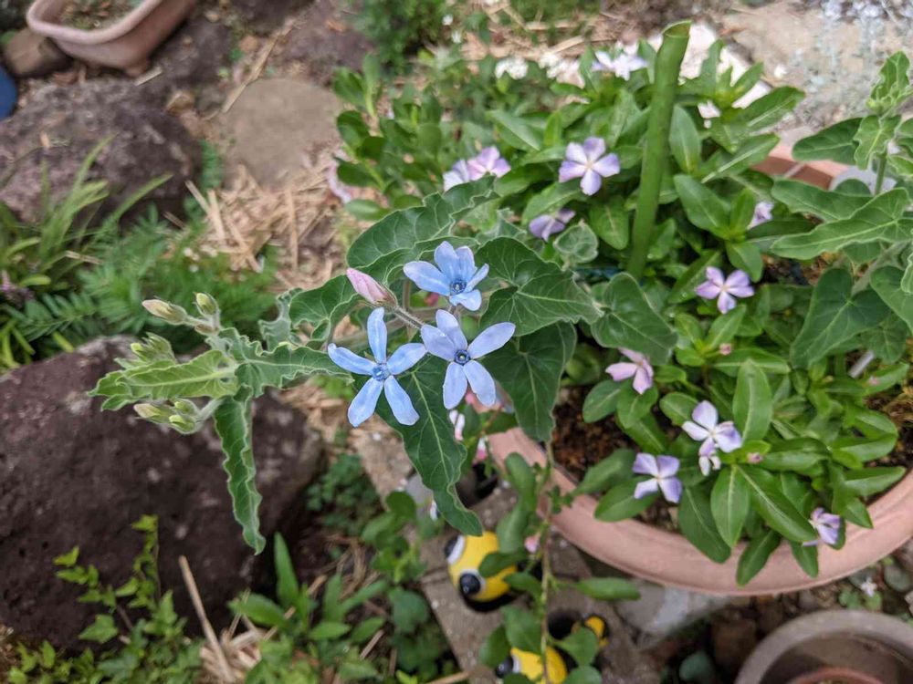 ブルースターと日々草の寄植えです。ブルースターは、切り戻しからの、再生しました。👍🦋🎶🐞🐝💞😅