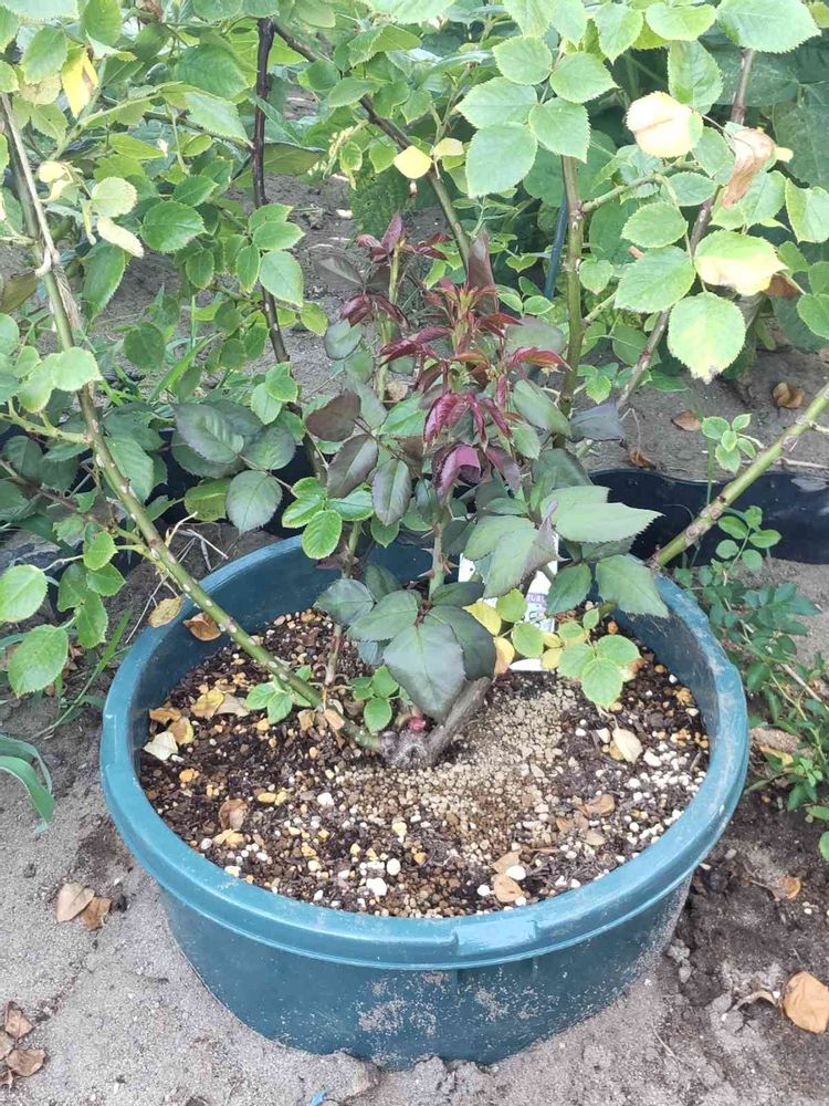古い漬物樽の底を抜き、ペンキを塗ってパッと見はグリーン系の鉢を埋めてある風に😃横から伸びてきてるミョウガが来ても直接根が絡まないように地植えしました。これはつるバラアンクルウォルターなので伸びたツルはミョウガの日除けをしてもらうべく横へ横へ伸ばしていく予定です。