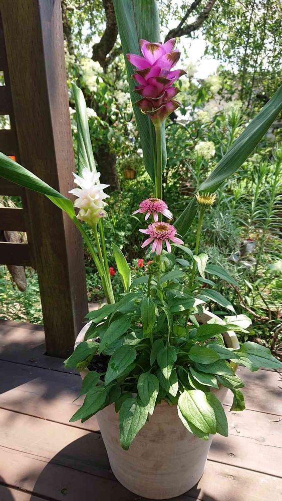 1ヶ月前に作った寄せ植えです。クルクマのパープルと白、エキナセアも咲き始めました。