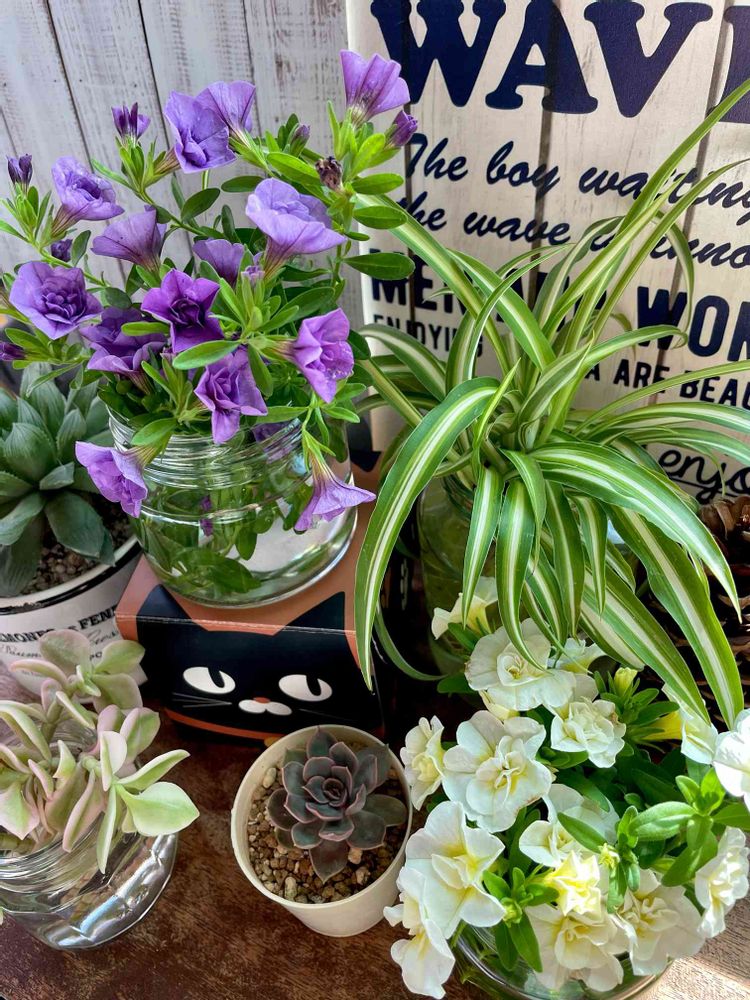 ベビーサンローズとオリヅルランも、空き瓶に(^^♪