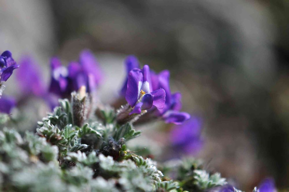 *大雪山の礫地、過酷な環境で強風を避けるように地表に張り付き花を咲かせる。