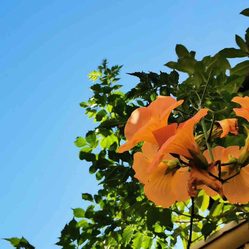 うちのお隣から毎年伸びてくるノウゼンカズラ💞お風呂、トイレから見えます(笑)