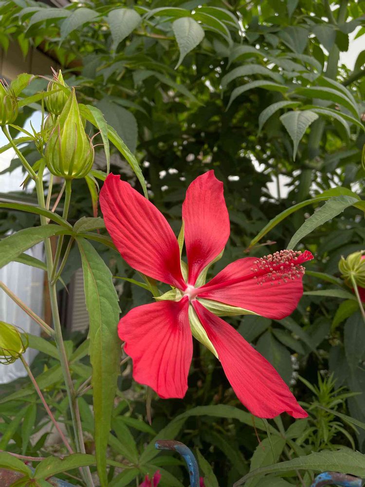 モミジアオイが咲いてきました。真夏っぽい花ですね。暑い暑い(~_~;)