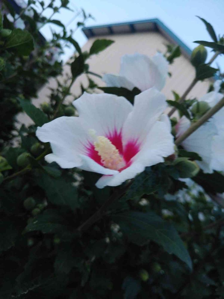 今日の汚庭のムクゲは涼しげなレッドアイさん