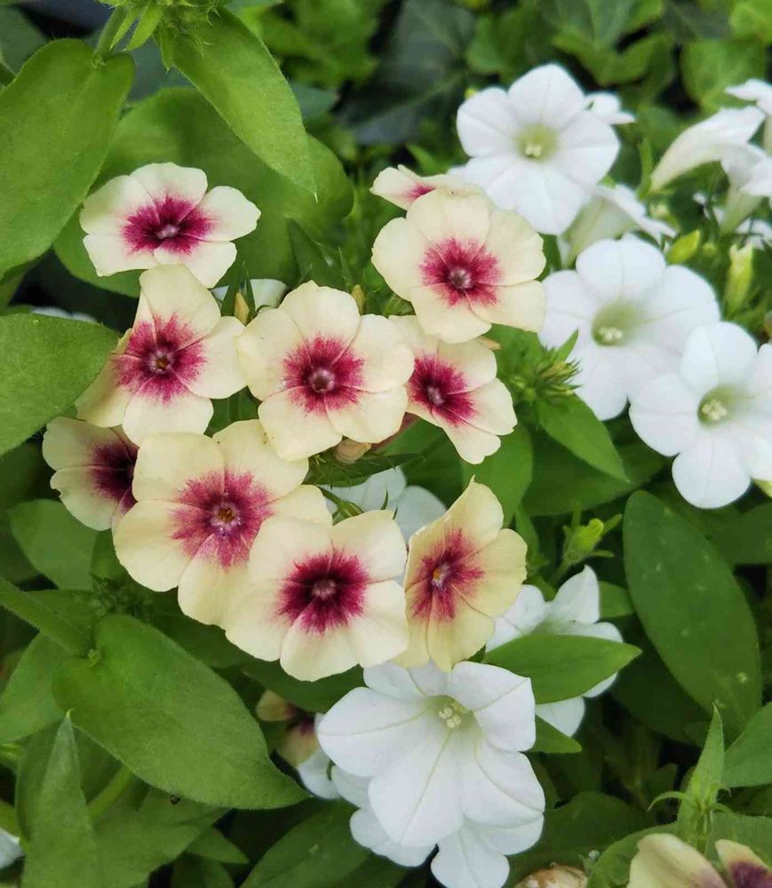 昨年育てたサフィニアアート「とらネコ」の零れ種からの白いお花と~(ღˇᴗˇ)。o♡