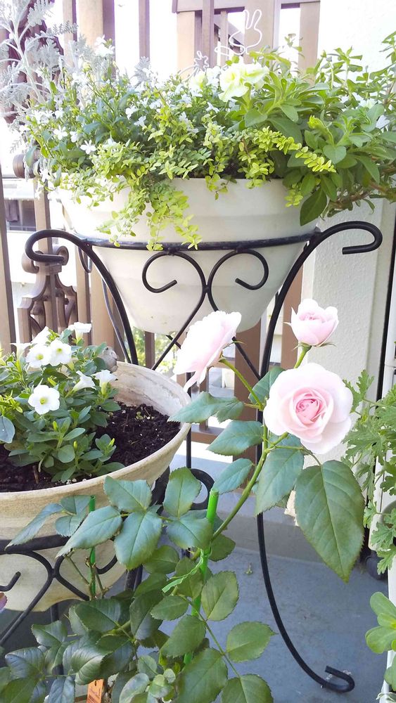 バラもきれいですし、上のグリーンっぽい寄せ植えが、とってもすてきです😃💕