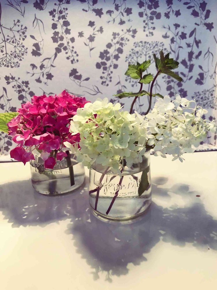 ノリウツギ リトルホイップ(?) と アジサイが今 最盛期です(机の上にもお裾分け)。