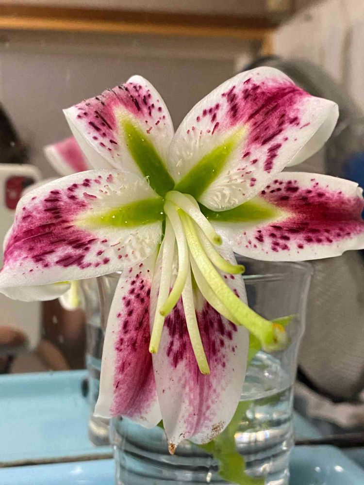真っ赤だったかのこ百合ですが、蕾が家の中で開いたら白い縁取りの可愛い百合に変身しました❣️
