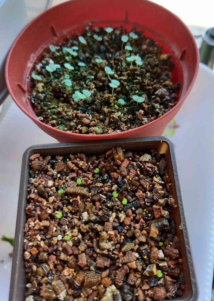 下はラコブスの実生。アナカンプロセス属で、桜吹雪の仲間です。たくさん種ができていたので試しに撒いたら2日位で芽が出てきました。