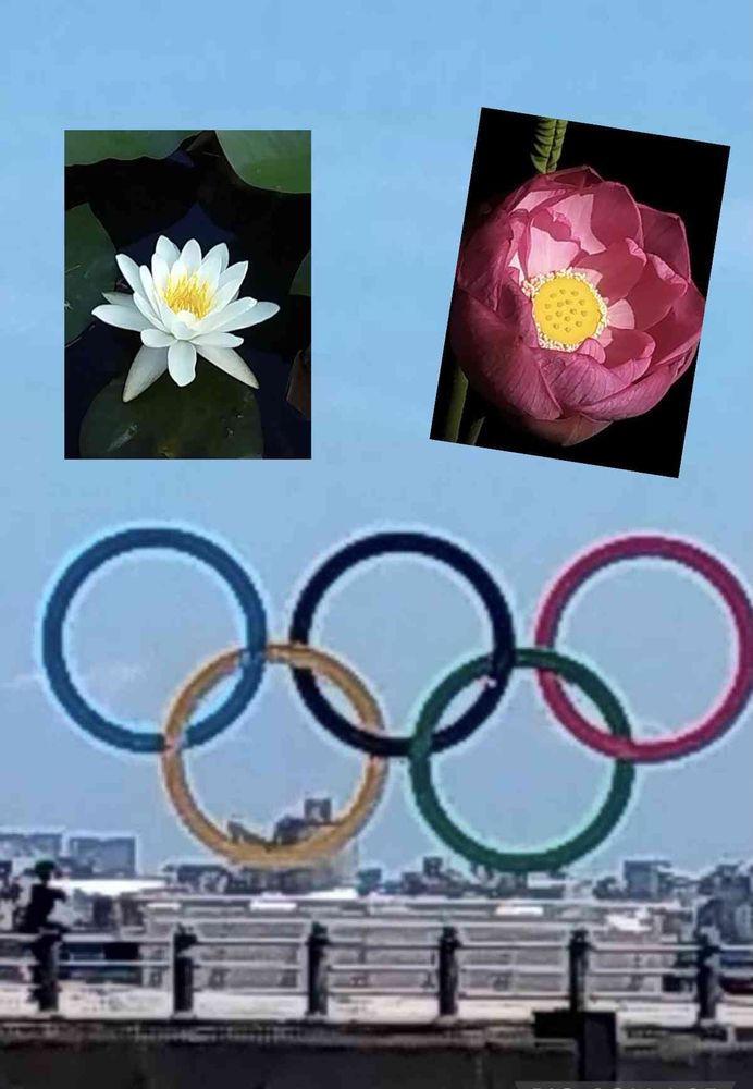 友達から、赤レンガ倉庫の五輪オブジェと三溪園の蓮の花の写真が送ってきたので