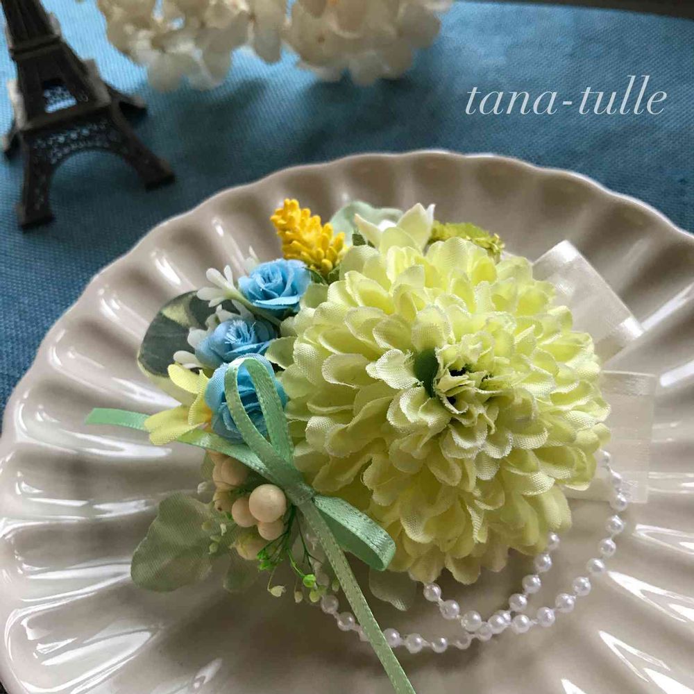 レモンイエローのピンポンマムとブルーのミニバラでアクセントをつけた爽やかな雰囲気のコサージュに仕上がりました😊💕