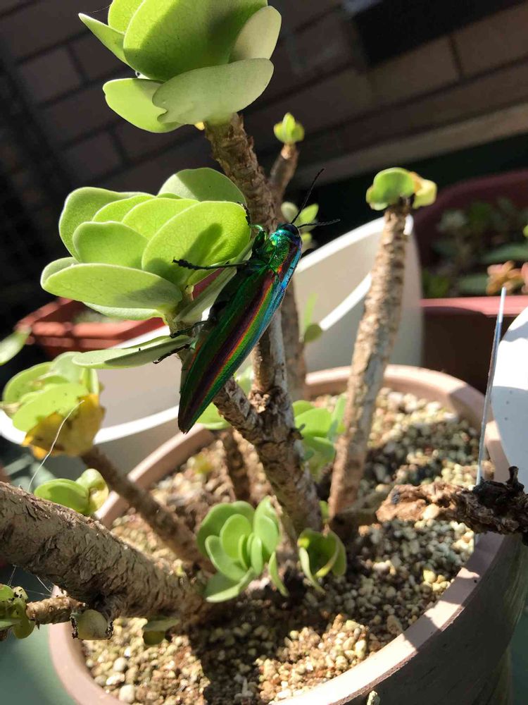 今日の占い、5位かぁ。まぁ、真ん中より上だわな。ベランダの多肉に行ってきますして出勤しよう。あれ、これは珍しい。タマムシが遊びにきてるよ。3位くらいでも良かったんじゃないの。😊