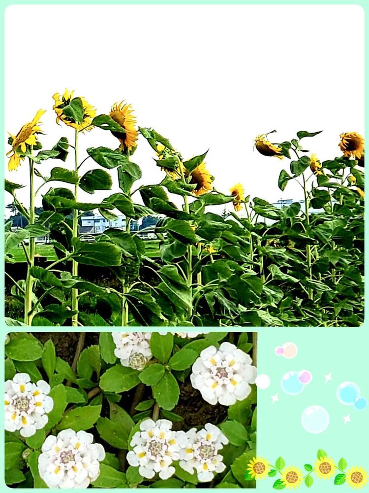 ずーと1キロ位でしょうか?ひまわりが植えられてたくましく咲いています🎵ふと下を見ると姫イワダレソウも咲いていましたよ~🎶