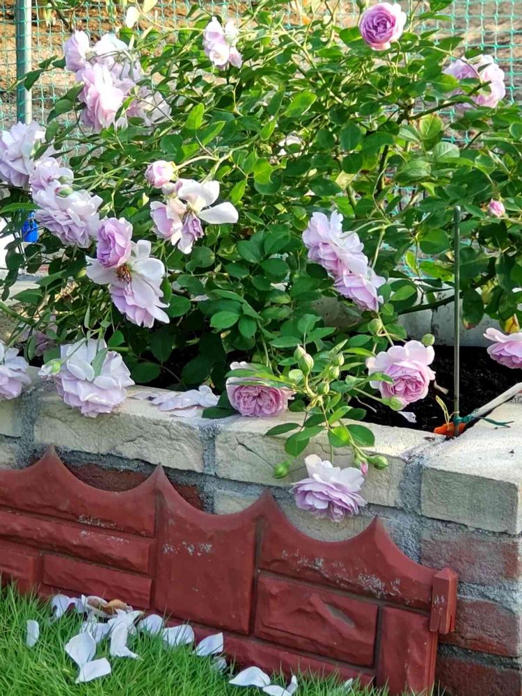 すっかり根のまわったレイニーブルーを地植え🎶後ろは畑だから橫張り性の🌹がちょうど良い😃ベンチから眺められるしの😁