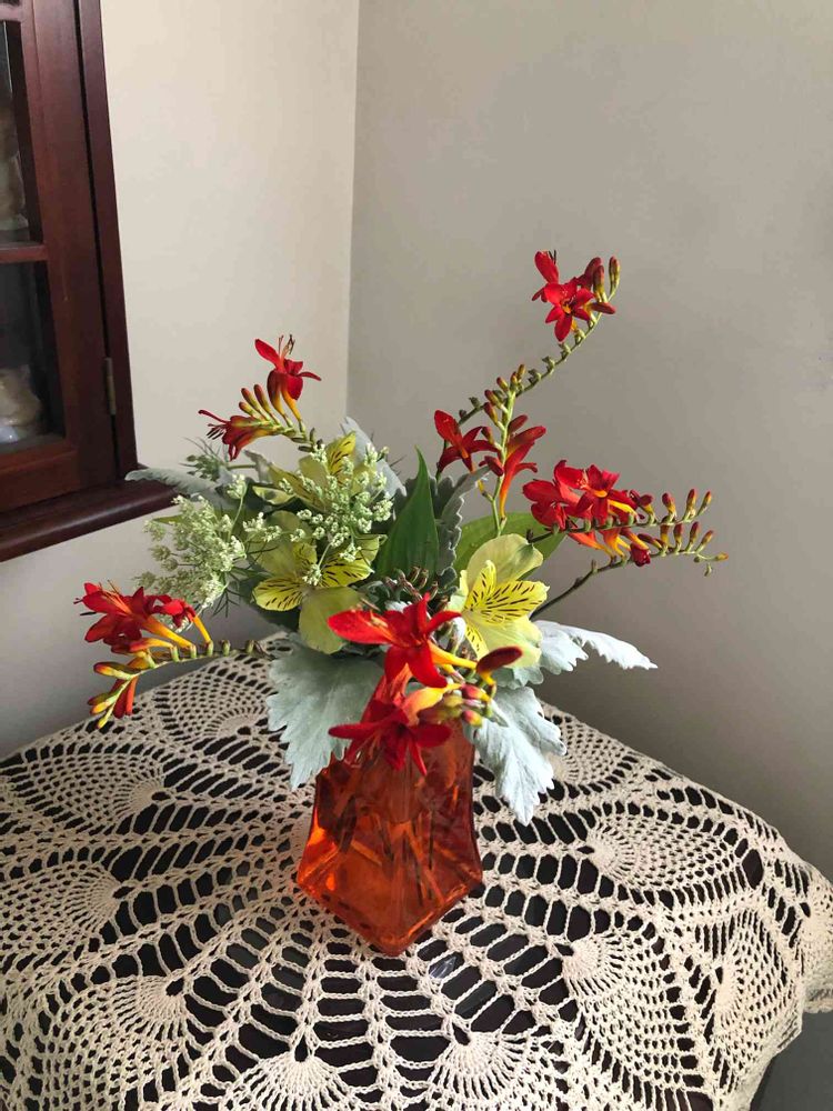 花材: アルストロメリア、クロコスミア/ヒオウギスイセン、シロタエギク、クイーンアンズレース
