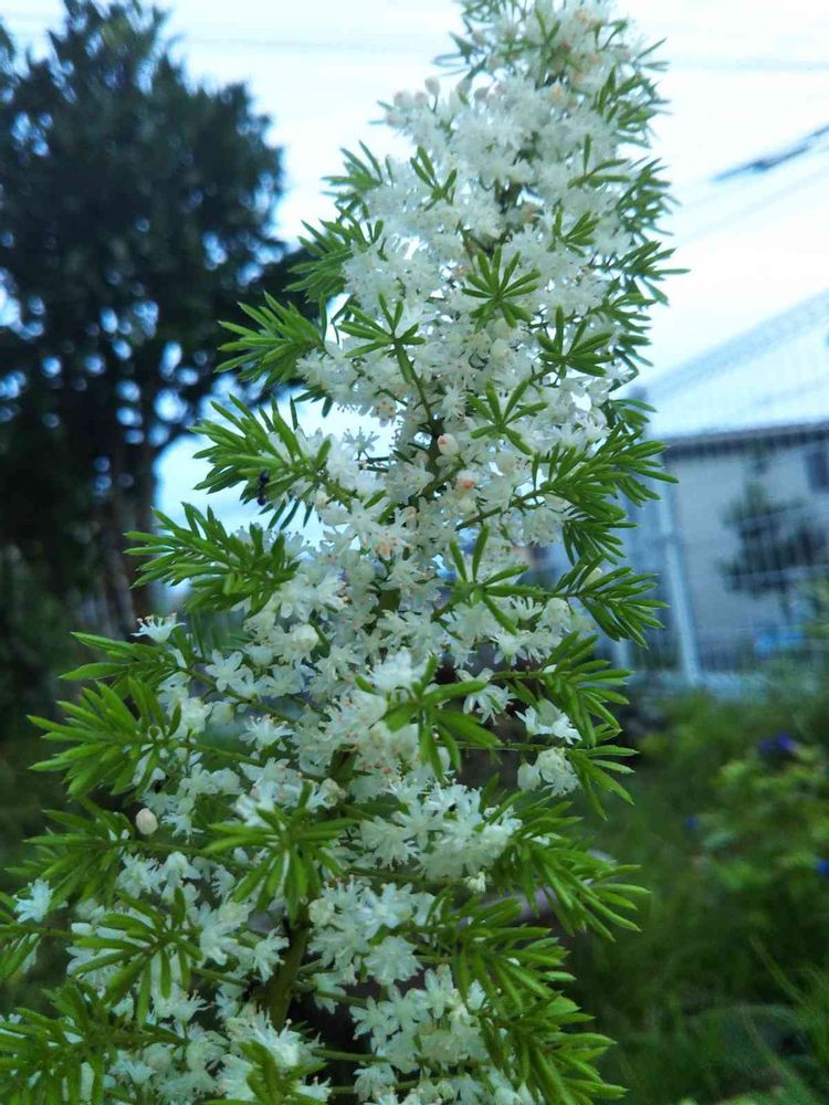 アスパラガスメイリー、植えた覚えがないのですが、玄関前のアプローチの端に いつの間にか咲くようになりました。地植えです。