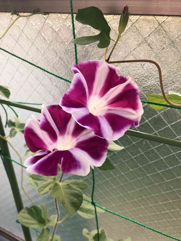 何年か前にベランダにネットを張り、二種類の朝顔を苗から育てた時の写真です。