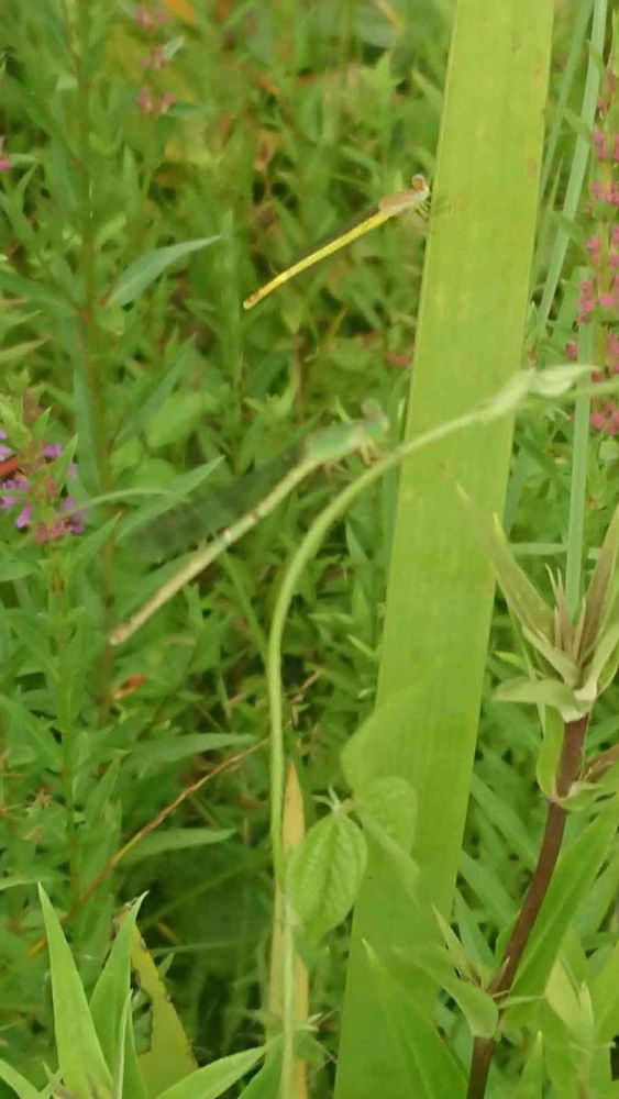 体長三センチくらいのキイトトンボ 手前のイトトンボは体長が少し長く胴が青いので別の種類か?