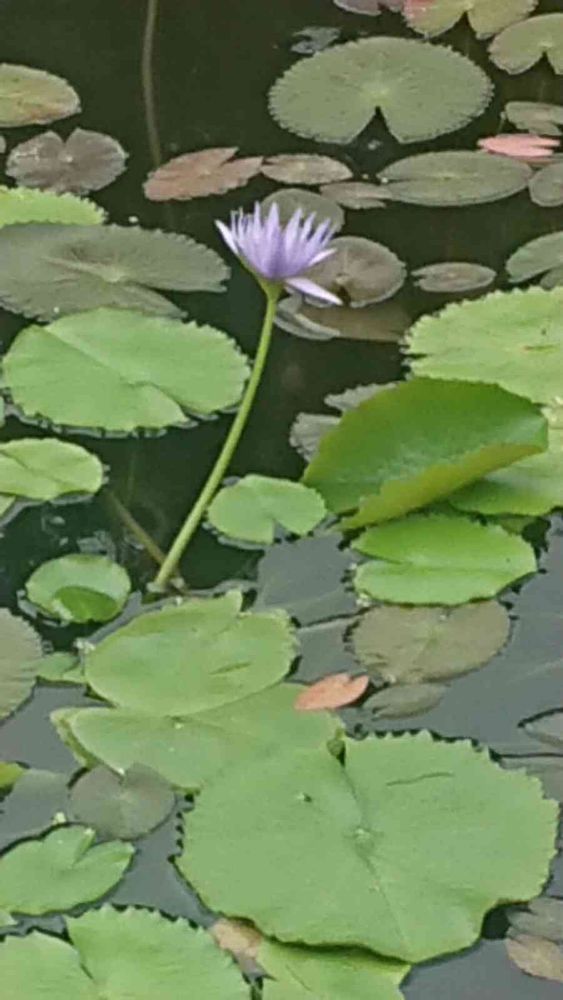 モネが咲かせたかった青いスイレン 午後に行ったので他のスイレンは明日に向けてつぼみばかり その中で花茎を長く伸ばしてひときわ美しいのですが少し遠すぎですね。🤗