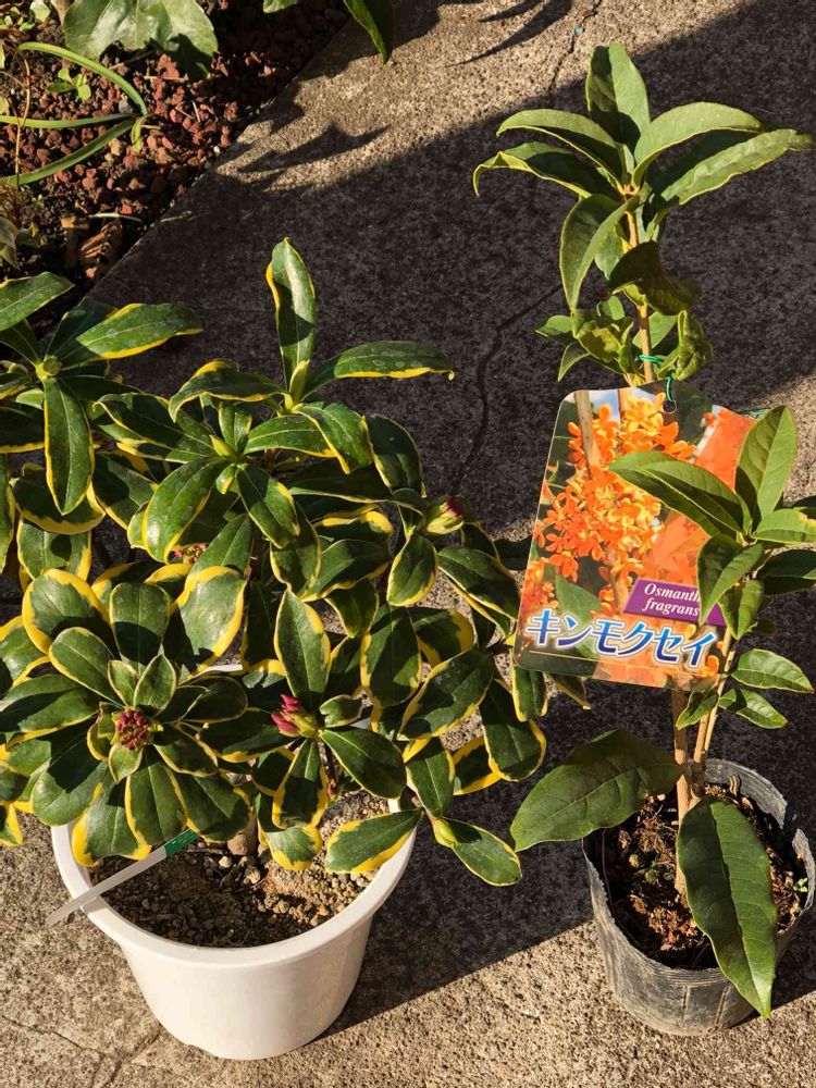 実家にあり、いつかは植えたいと思っていた沈丁花と金木犀を植物園のお店で見つけて買ってきました😊💕しかもこの沈丁花は私の大好きな斑入りです\( ˆoˆ )/店の人曰く、花を楽しみたいならそのまま鉢植えで、地植えすると成長に栄養を取られるから花つきが悪くてなるよという事で、悩んでいます~_~;でも大きな金木犀からぷ〜んと良い香りがよくしてきますよねえ?どーしようかなあ。いや(^_^;)地植えする方向で気持ちは行ってるのだけど、管理が難しいのかな?でも場所も無くなってきたしなあ〜😅🌀着いていたタグに前鳥沈丁花と書いてありましたが、調べてもヒットしません。間違いかな?