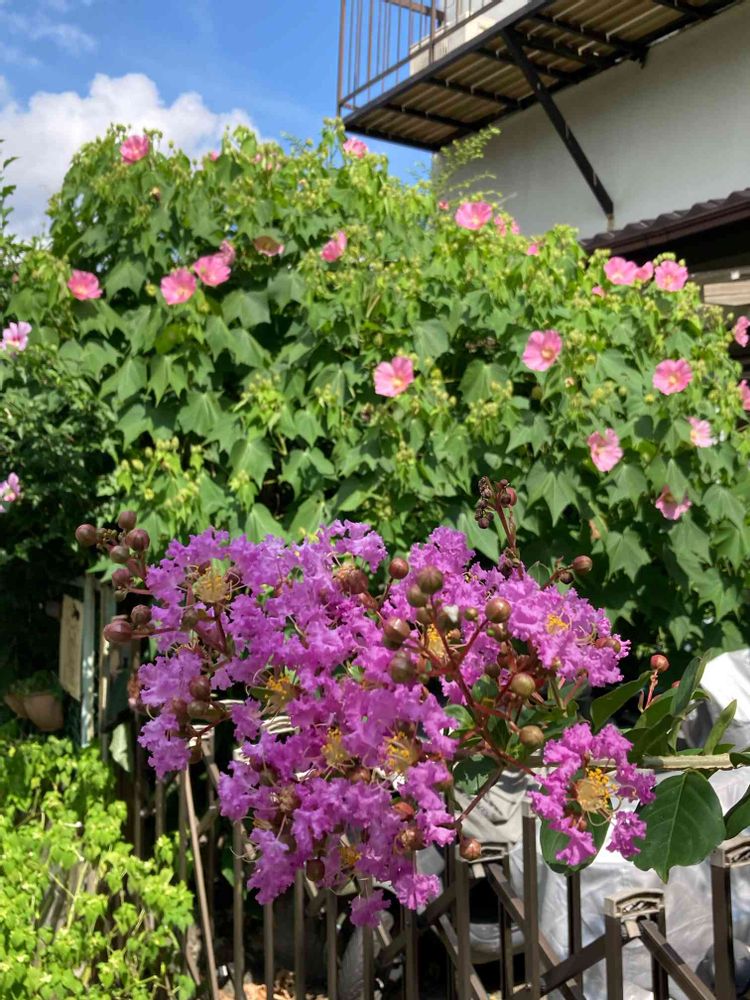 2021.7.25朝 6日の投稿から20日ほど経ったサルスベリ。次々と咲いてまさに百日紅です。背景にこれも夏の花 芙蓉が。