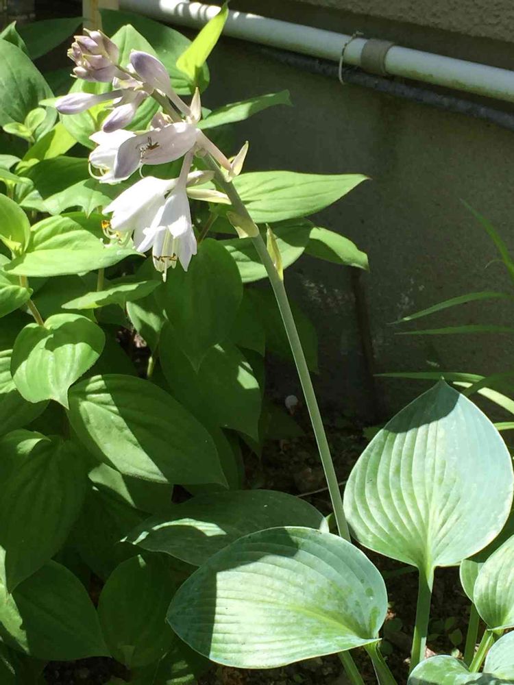 ホスタ「ハルシオン」。2019年に苗を購入して地植え。スモーキーな葉が美しいホスタです。花もグレー味がかかっているように見え、シックです。