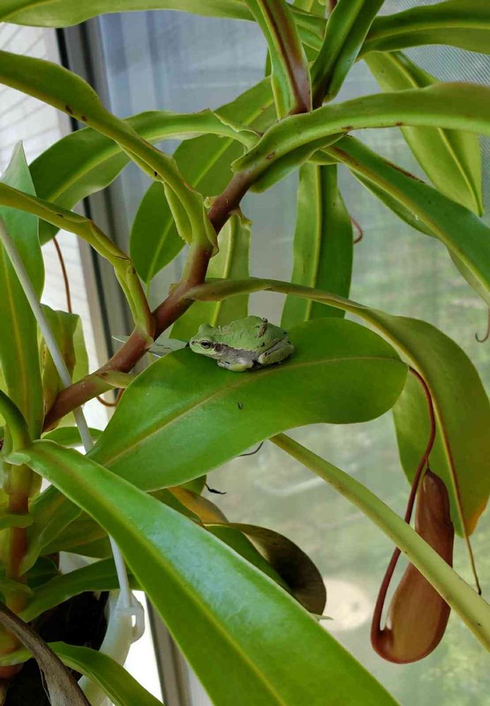 軒下に吊り下げているネペンテスアラタの葉っぱにアマガエルを発見🐸