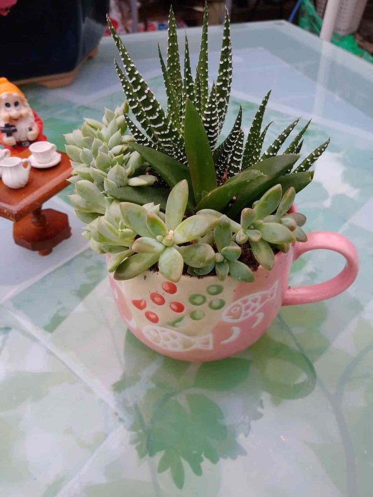 茶碗蒸しの容器にドリルで穴を開けて鉢にして多肉を寄せ植えしました😊