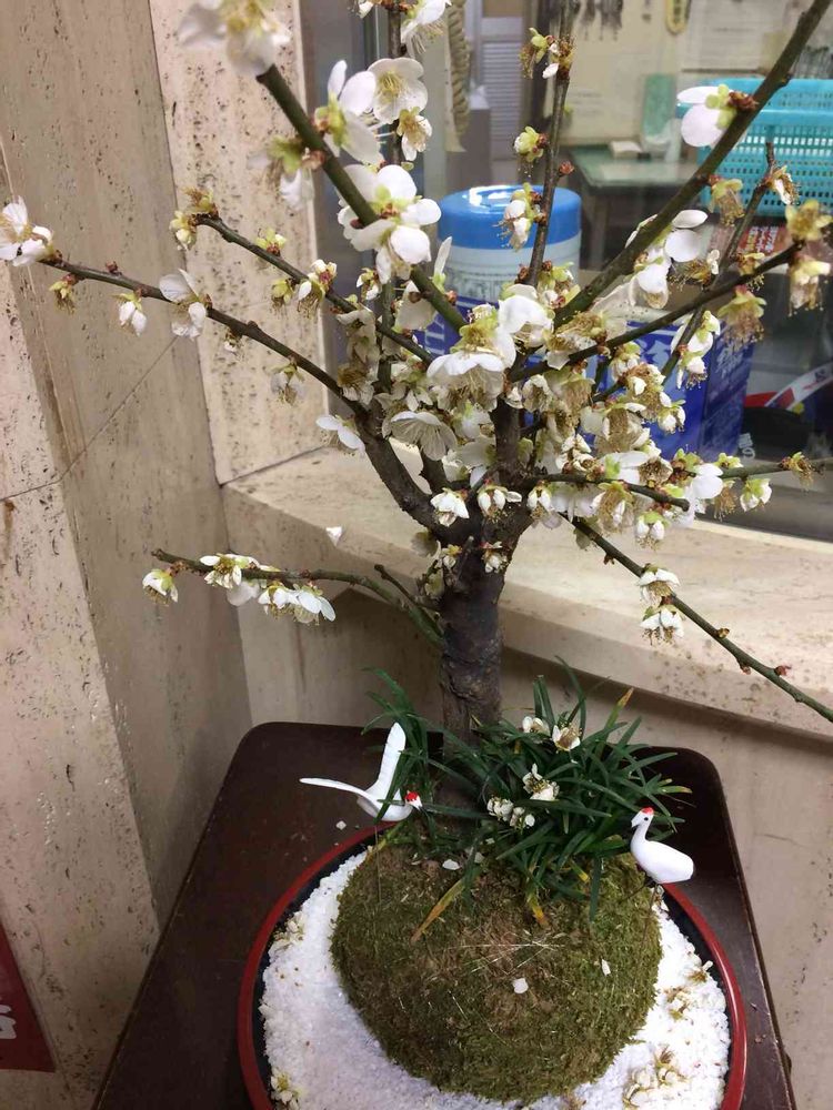 職場のカウンターに飾ってある白梅の苔玉です。今年は自分でも苔玉作りにチャレンジしてみようかしらん。^ ^