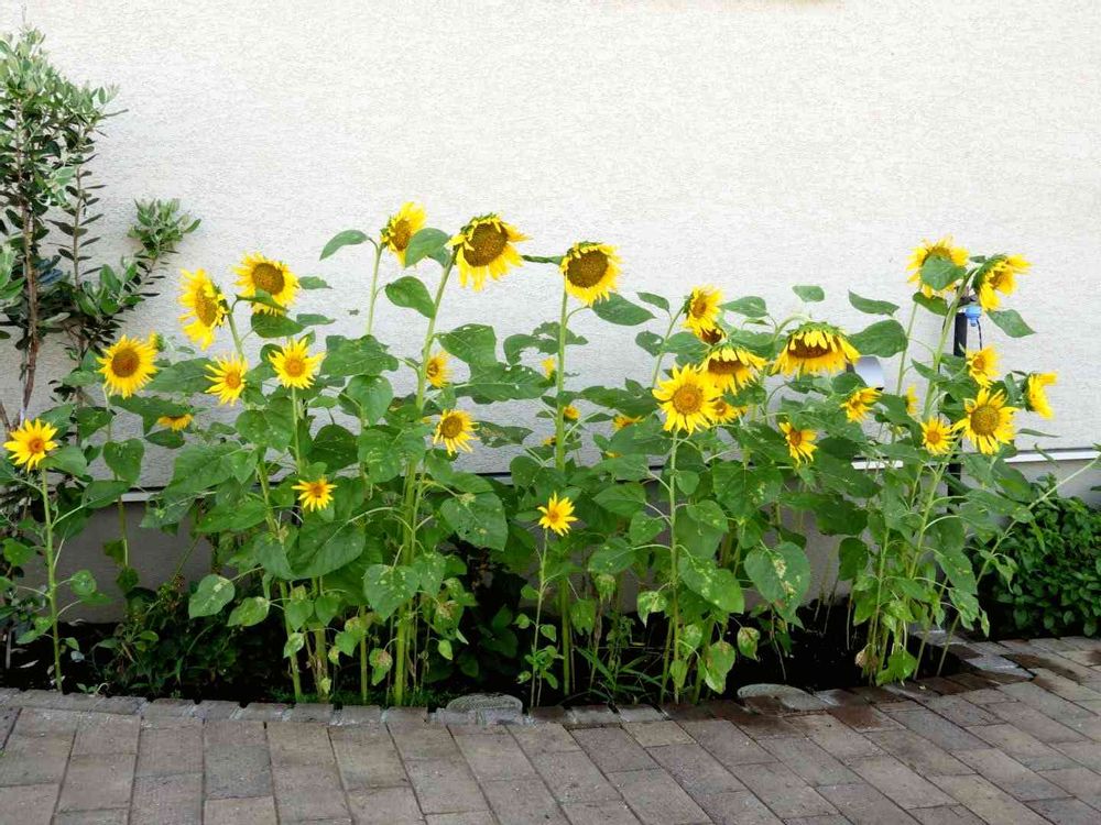 通り道のお宅の前の、玄関の彩りの、黄色い向日葵