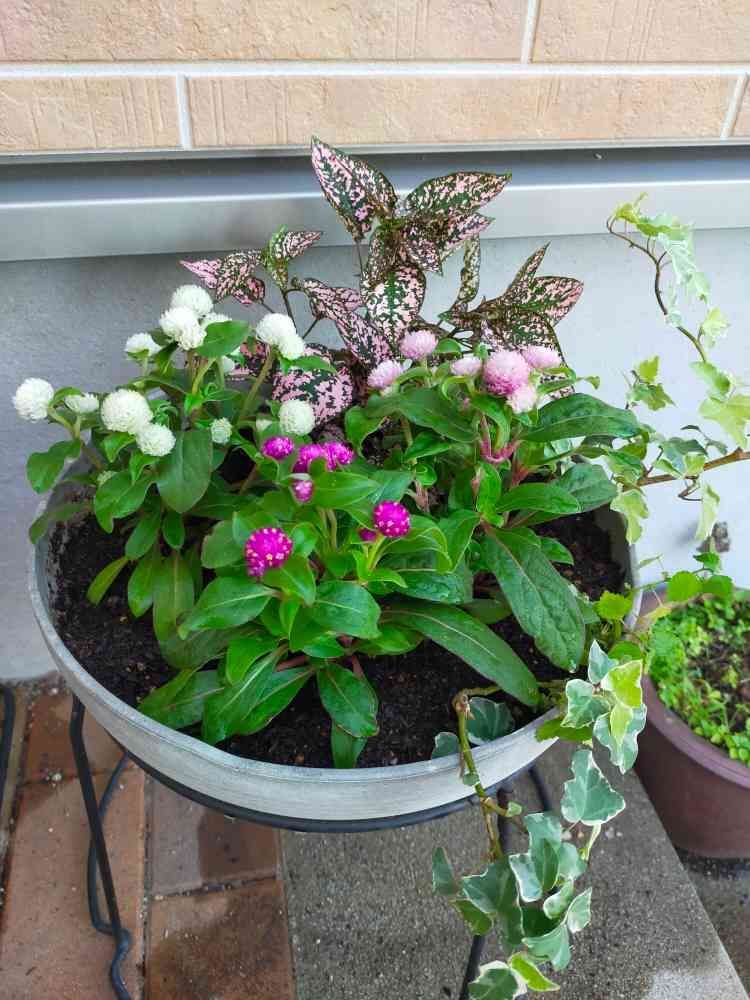 千日紅3色とヒポエステス、ヘデラの寄植えをしました。
