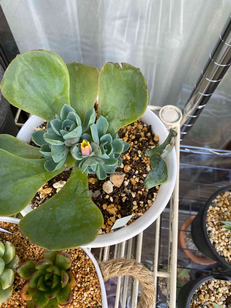 巨大七福神! もうダメかも😢って思って… ダメ元で胴切りしたのが一ヶ月ちょっと前。そしたら、こんなに子株が🥰 しかも花芽も🌸 諦めなくて良かった😆