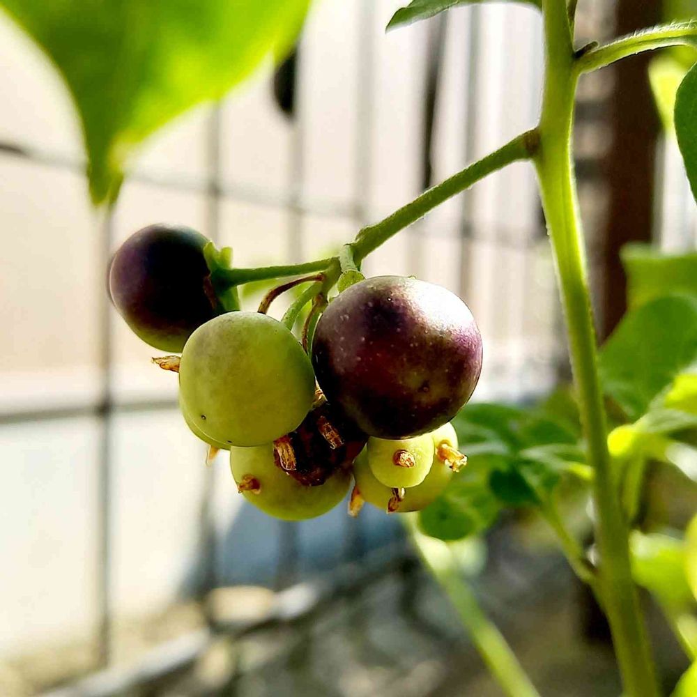何かのおまけに付いてたガーデンハックルベリーの種が育って実がついて、だんだん熟してきました😊
