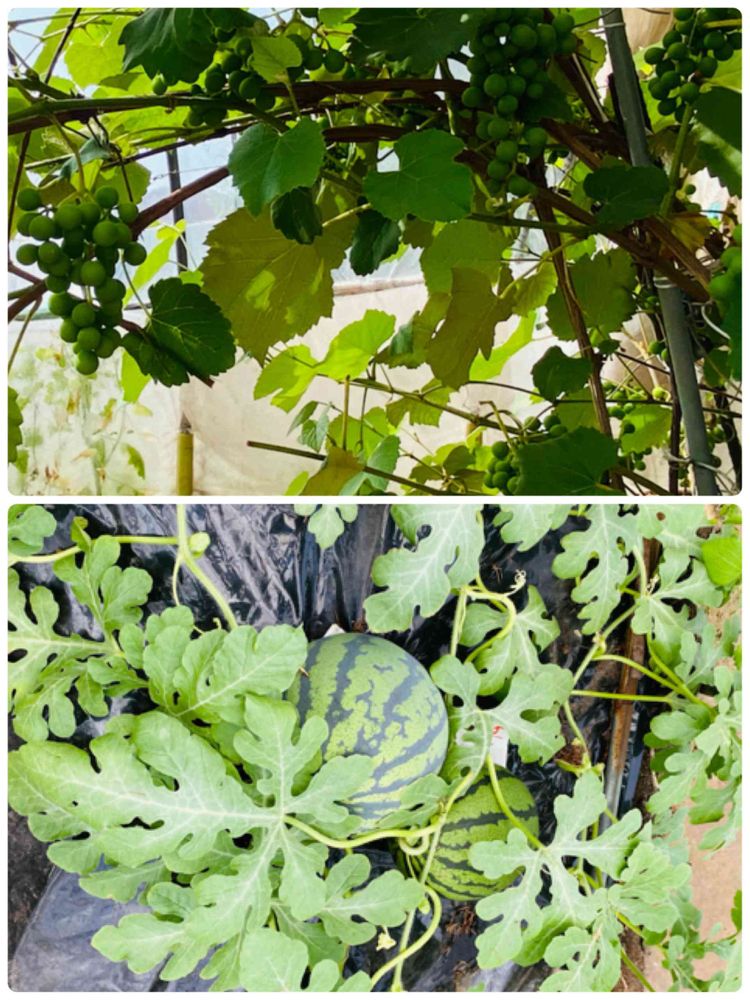 ビニールハウスで育てているブドウとスイカたちも今年は連日高温が続いているので実の付きが良いそうです。