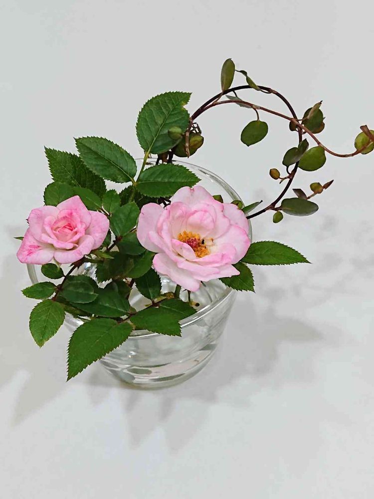 母の日にもらった鉢植えのミニバラが この猛暑の中 咲きまして