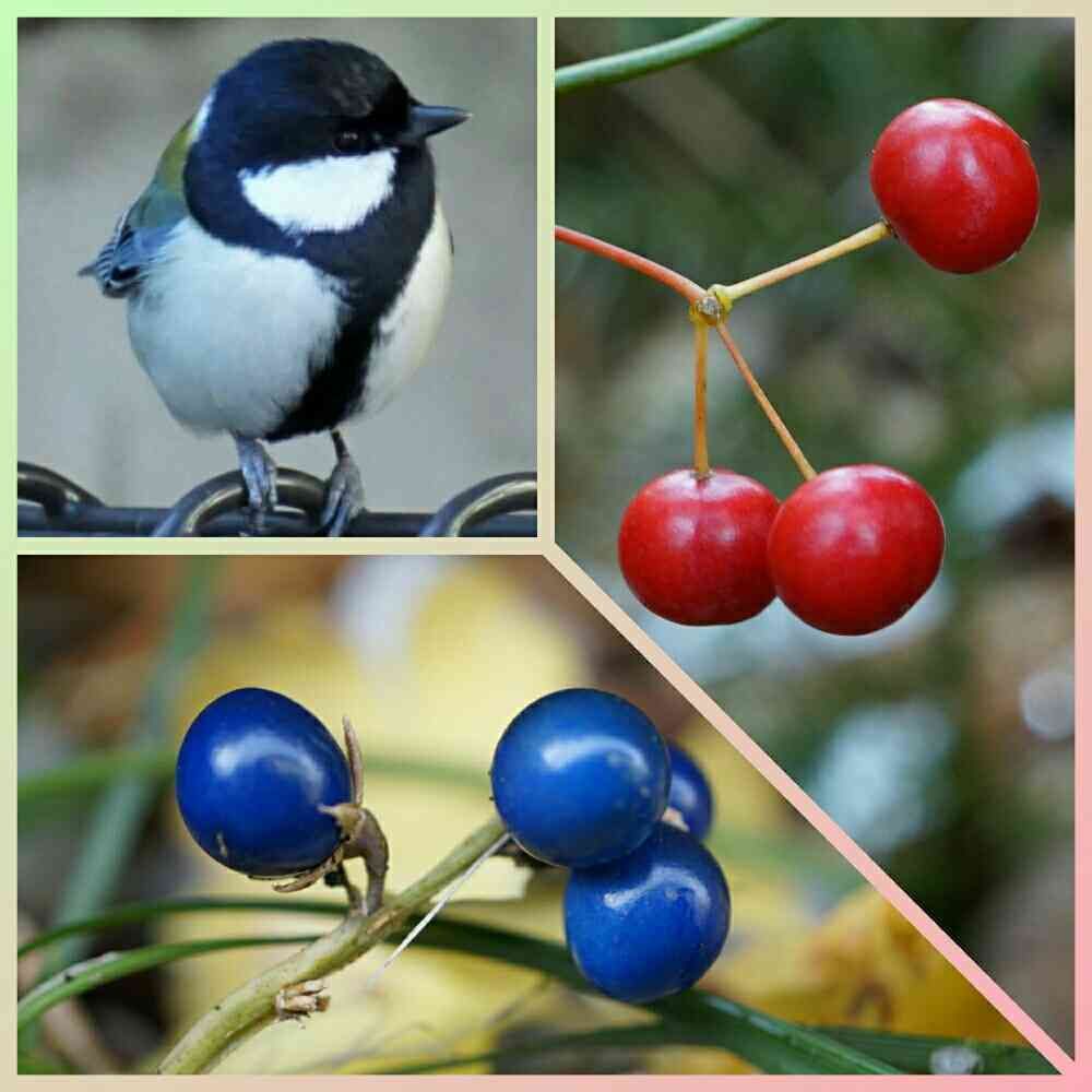 男の子のシジュカラさん🐦 ですか😍 可愛いいですね🎵赤い実も青い実も艶々で可愛いい💕