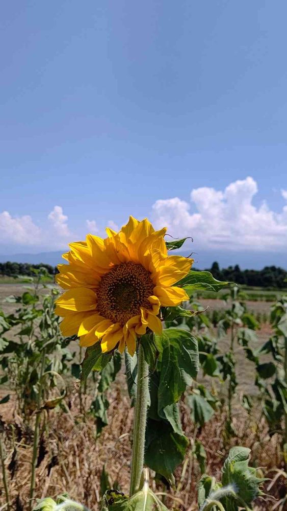 あまりの暑さに葉が萎びていますがその中に暑さをものともしないひまわり一輪