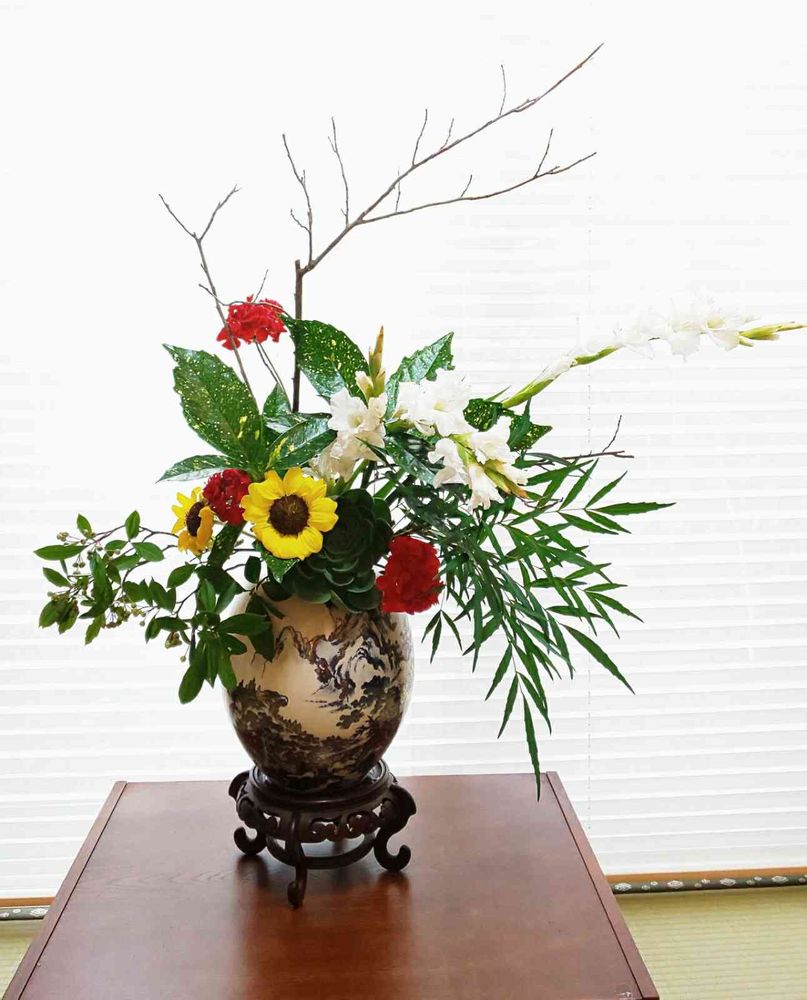 使いにくいお花器を上手に使いこなしました。右のグラジオラスが重く見えるようでしたら左の実物の後ろにもう少し高めにアオキを加えると良さそうです。