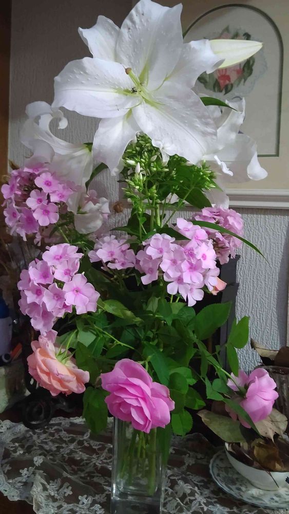 ご近所の花友さん一本だけを見ててバラとフロックスを切ってきてくださった。いつも有り難う
