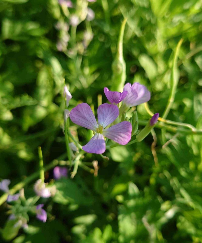 先が淡紅紫色、基部が白色の十字形花をつけます。花後は、ぷっくりした豆のような果実ができます。(奥に写り込んでます😊)