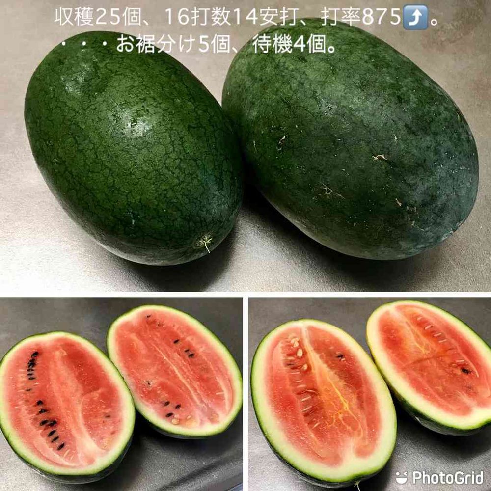収穫後に冷蔵庫で待機中だったスイカ🍉2個を「パカっ!」とな×2。安定の合格💮×2、打率も鰻登り👍。
